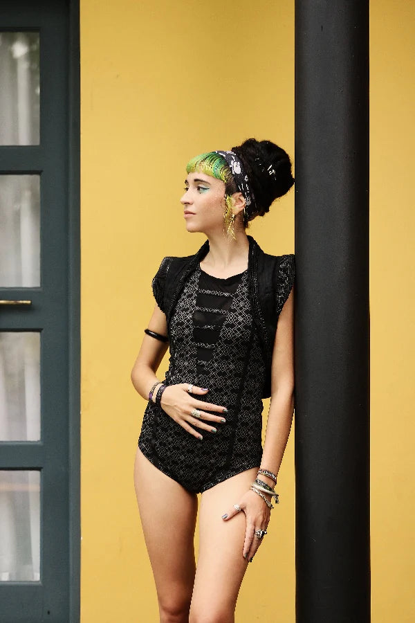 ¡Gran adición steampunk! Hecho con un hermoso algodón tejido a mano, este chaleco corto tiene un cuello ahumado y mangas cortas completamente decoradas con cremalleras de plástico negro. Esta prenda utilizaba 5 metros de cremalleras para cada chaleco haciendo de cada uno un tesoro único. -- Este es uno de esos tesoros que guardarás para siempre....